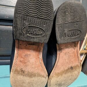 This listing is a pair of Justin vintage leather black boots size 6. Good used vintage condition, light exterior wear.