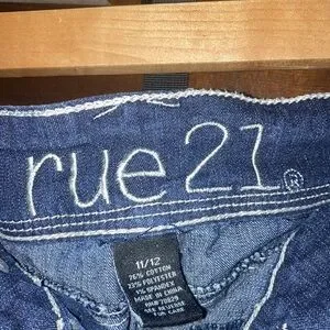 These Rue21 blue Capri jeans feature a medium to dark wash with visible distressed areas for a trendy, worn look. The prominent cuffs at the bottom add a stylish touch, making them perfect for casual wear.
