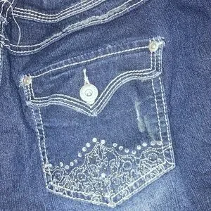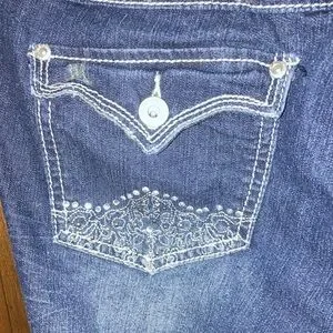 Small tiny Rhinestones on back pockets. There may be a few loose or missing. Not many are missing at all though You can’t tell for the ones that are missing.