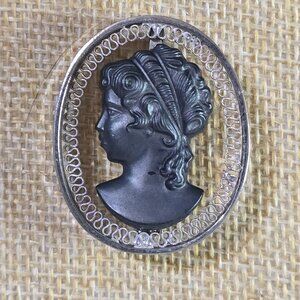 Vintage black glass cameo suspended in over silver tone surround brooch.