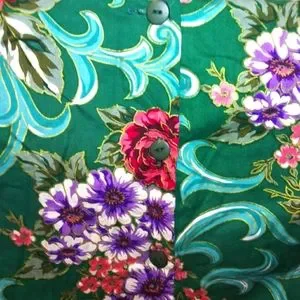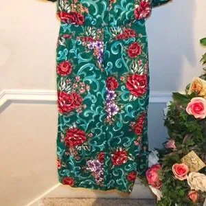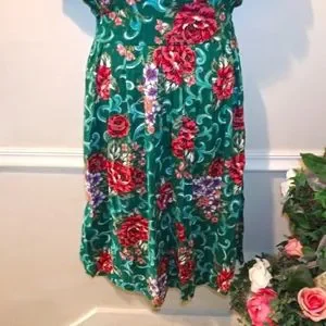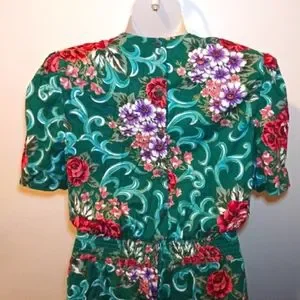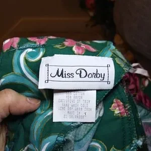 NWOT Beautiful vintage 1980's, teal, burgundy, purple, mauve and green floral pleated bodice dress with lace trimmed neckline, inset waistband, and full above ankle skirt from Miss Dorby. The floral design is also outlined in gold metallic, almost looks painted on, giving the pattern a bit of sparkle. This has a definite cottagecore/Gunne Sax vibe to it. Dress has both shoulder pads and stiffening to make the puff sleeves stand up, and bodice has buttons running down the back to the waist, which is smocked elastic on either side of the hidden zipper. There is a faint spot on the lace, please see photo, since this is new without tags I didn't try washing it, leaving it up to buyer if they want to spot clean, dry clean, etc. This is also a petite length, but I'm 5' 5 and it hits me about 5 inches above the ankle, so if you're taller it will just be a little shorter. Bust 21, waist without stretching 13 3/4, hips 26 inches, length 48 inches. Please see all photos, pricing accordingly for spot.