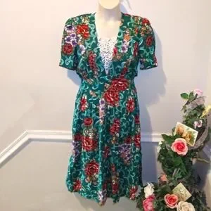 Miss Dorby Vintage 1980's Teal Burgundy & Purple Floral Cottagecore Style Dress