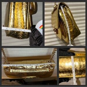 THIS BAG IS DISCONTINUED! Michael Kors Small Sloan Python. Go from shoulder bag to crossbody in a flash! This golden beauty features a chic python-embossed leather, giving it a luxurious and textured look. It has a front flap with a push-lock closure nailhead snap on the metal logo engraved front plate. Only those who know these bags will know how to open lol And the gold-tone chain strap can be worn as a shoulder bag or crossbody!