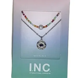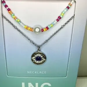 INC International Concepts Mixed Bead Collar and Crystal Evil Eye Pendant Necklaces 2 Pc Set. Multi- colored mixed beads (a few beads overlap- see photos) with silver-tone mixed metal chains. Lobster claw closure with extended length. Necklaces can be worn separately. (*Manufacturer photos may show pendant slightly brighter than it actually appears.)