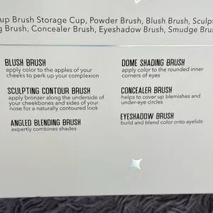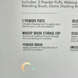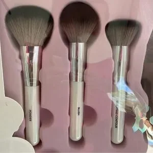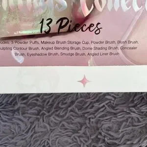 BNIB Essentials Collection Makeup Brushes,Skull head Brush Holder,and Sponges.The top of the box got wet but nothing but the box was damaged. It's a metallic light pink color, very pretty.