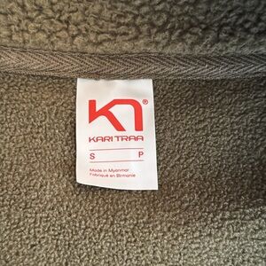 Kari Traa Sherpa full-zip, women’s S, EUC. Olive green with burgundy and pink trim and orange scents on the zipper pulls. One chest and 2 front zippered pockets; all zippers work perfectly. Sherpa texture outside and a softer micro fleece texture inside. Light wear to cuffs and typical light wear to Sherpa exterior. No flaws. Somewhat of an oversized fit.