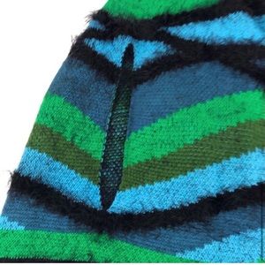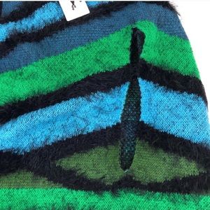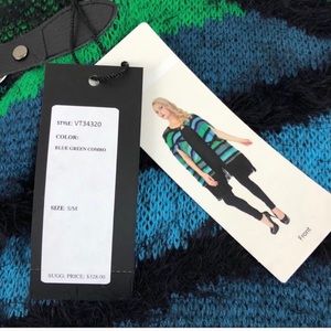 NWT Vertigo soft fuzzy fringe poncho/cape sz S/M. Blue/green with black fringe. Lobster claw closure. New with Tags