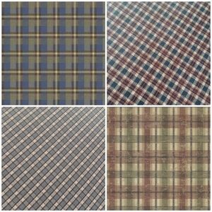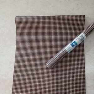 A small plaid check wallpaper brick red and denim blue with beige. Pairs well with Americana, country, and rusic cabin decor!