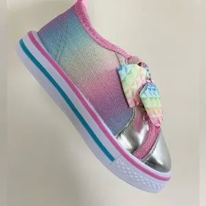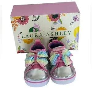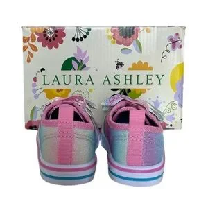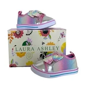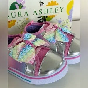 Laura Ashley Toddler Baby Girl Pink Sparkly Rainbow Slip-on Sneaker. Baby size 5. Pink, purple, blue and silver colors. New in box. Elastic laces and accent bows on front. Slip-on style. Solid rubber soles. Comes with original box- box has minor damage. Some manufacturer pink rubber marks on exterior and mark on sides and front. See all photos.