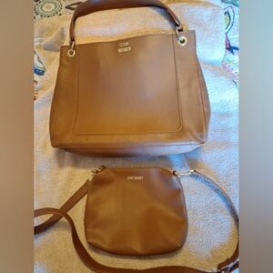 Pair of Steve Madden purses, light brown/tan. Larger purse 12x16, smaller purse 8x10 with long adjustable strap. They look never used. flaw in stitching on larger purse as shown in photos. Great set.