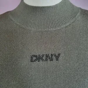 NWT DKNY Jeans Olive Green Short Sleeve Mock Neck Rhinestone Logo Knit Top