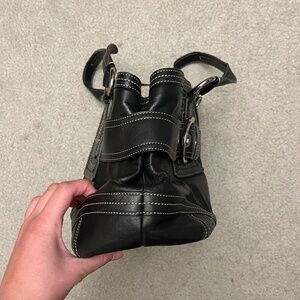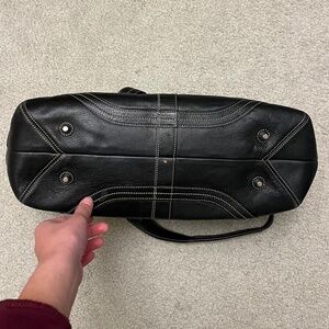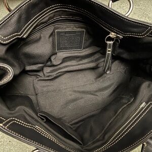 Pre-owned Coach Hampton Black Leather Tote Purse Handbag Satchel. A black leather Coach bag that is medium size. Medium black leather handbag. Has multiple interior pockets. 2 regular pockets and 1 zip pocket the inside is clean and spacious. In great condition no visible scratches or damage.