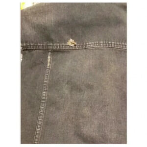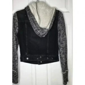Super cool jacket by FREE PEOPLE. distressed black denim body with heather gray/black knit sleeves and hood. Button closure. Drawstring at hood. Some unraveling of stitches on sleeves, see all pics. 100% cotton. Underarm to underarm measures 17” laid flat. Retail price was $148.