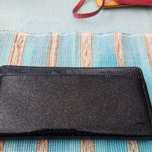 Stylish black wallet with glitter. Features a sleek design. Perfect for any occasion. Lots of space inside. Has a sparkly, blue metallic look.