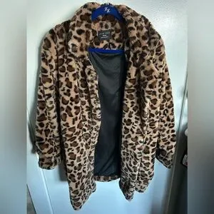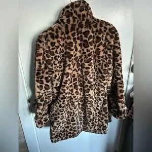 Woman’s faux fur animal print coat. Size medium tan with brown and black animal print. In very good condition.