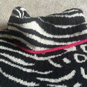 Very soft and comfortable, always love black & white and of course, animal prints! Pink accents on neck & sleeves highlight the black & white. Has a loose turtleneck- kinda in between turtleneck & cowl neck.