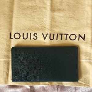 This is a stunning long wallet by Loius Vuitton in a deep green taiga leather. Excellenct condition. 14 card compartments and 2 large compartments for bills.