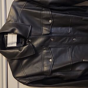 Stylish black faux leather jacket. Features button-up front and chest pockets. Perfect for a chic look. Light weight.