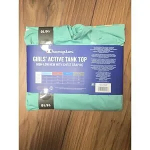 This Champion tank top is designed for girls in size 14-16. It features a high low style with a graphic print in green, making it a stylish addition to any girl's wardrobe. The sleeveless design and blend of polyester and spandex materials provide comfort and flexibility for everyday wear. Perfect for casual outings or sports activities, this tank top combines both fashion and functionality for girls on the go.