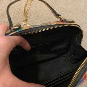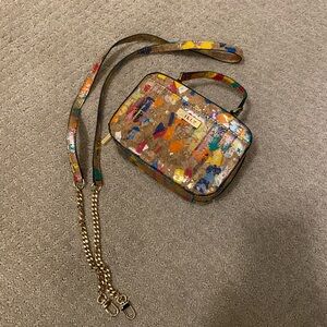 Darling colorful crossbody bag. Great for a night out or travel. Card holder and zip compartment inside. Seldom used. Front pocket. Strap included. Approx: 4-3/4” tall x 6-3/4” wide x 2-1/2” deep. Has a neat cork appearance. No flaws. Non-smoking home. Fast shipper. Ready to go!