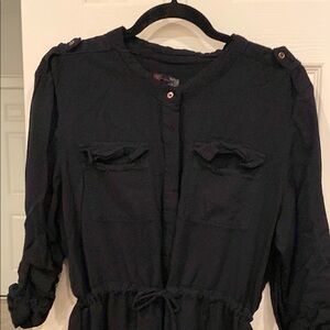 Stylish black dress with button-up front. Features long sleeves and a cinched waist. Perfect for any occasion.