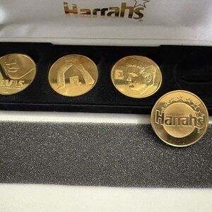 Harrah’s Hotel and Casino gift set of Elvis Presley gold plated tokens in original velvet box. Each of the 4 tokens has a different pose of Elvis. This set was given by Harrah’s as a gift in the early 2000s.