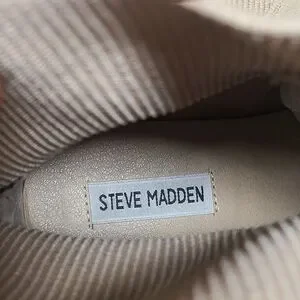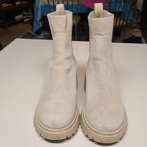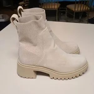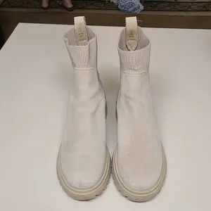 Steve Madden Holley Chunky block heel Chelsea ankle boots. Sand Beige suede upper with ribbed fabric back and rubber lug soles. Size 10 in great used condition.