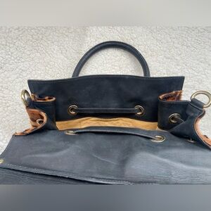 Double top leather handles, front face plate clasp closure and caramel suede interior