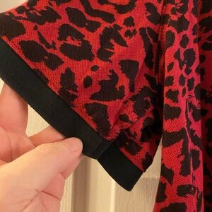 Loose/boxy/relaxed fit. Dark red background with black animal print. Collar and cuffs are black. Small side slits at waist.