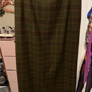 Vintage Pendleton wool plaid midi skirt. Could be ankle length on someone shorter. Satin lined. Back slit. Size 14, fits like a 12. Green plaid- classic wardrobe staple for the fall and winter. Make an offer!