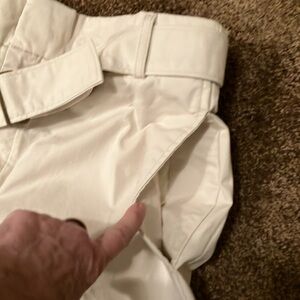 BANANA REPUBLIC. This is a pair of ivory colored authentic Chino pants for women. Size 12. They have an ultra high-rise. They run straight through the hip and thigh. They are full length. They have two buttons at the hem line. The belt comes with it. They are extremely nice pants. They are 11 inches in width across the thigh. I feel like these pants would have a lot of room in them. They would not be tight fitting. They have two pockets in the front and two pockets in the back and all four are functional laying flat, the waist measures approximately 17 1/2 inches. These are brand new with tags. They retail for $80. NWT