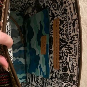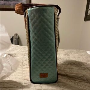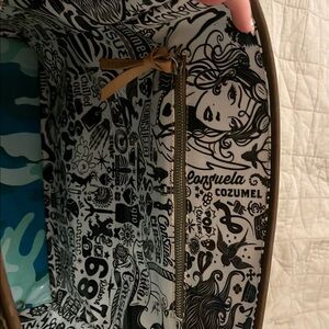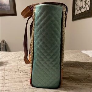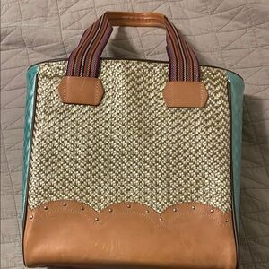 Stylish Consuela tote with vibrant embroidery. Features multicolor handles and woven texture. Perfect for any occasion.