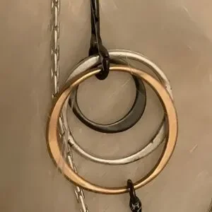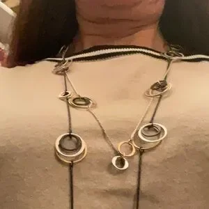 Bracelet has elastic, so it stretches to fit many wrist sizes. Double-stranded necklace is about 18 inches long. Both have pretty copper coloring. If you want this and two other similarly marked closet items for $15, make a bundle and offer $15.