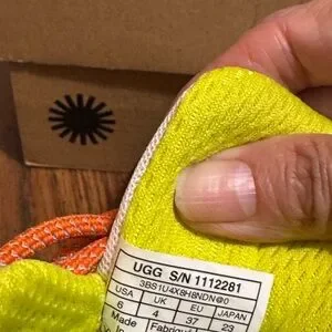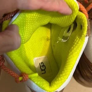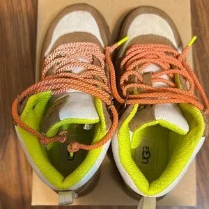 Stylish UGG sneakers with vibrant orange laces. Features a brown suede exterior and bright yellow accents. Perfect for casual wear.