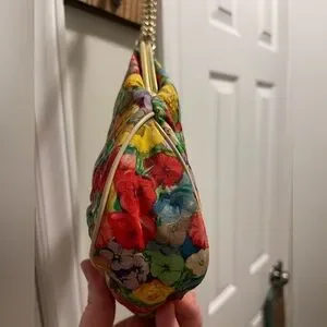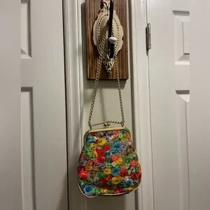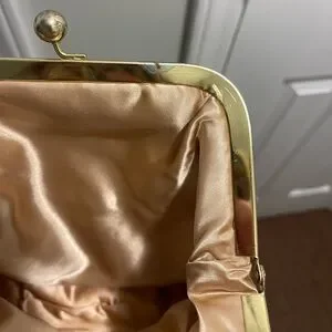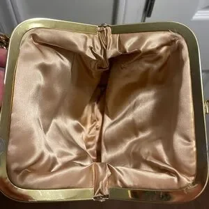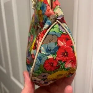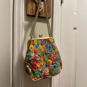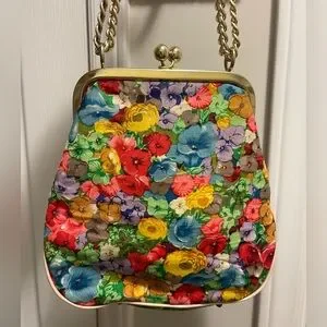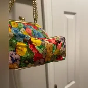 Town & Country brand bag features a multi-colored satin-like floral fabric exterior, gold metal frame with kiss clasp closure, ivory grosgrain fabric lined interior with slip wall pocket, gold chain handle that can be worn short or long and four metal feet on the bottom for protection. Interior fabric is in excellent condition, only call out is a small area of discoloration on the interior metal trim as shown in photos.