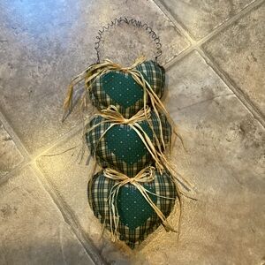 Primitive Country Green Tan Plaid Plush Heart Raffia Wall Decor
