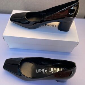 Elegant black patent leather heels by Calvin Klein. Perfect for any occasion.