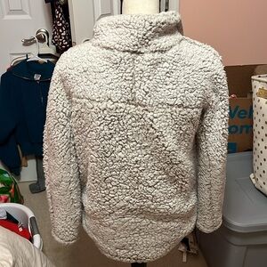 No longer am needing this beautiful very soft and keeps you warm and cozy Sherpa pullover. Made from 100% polyester material, perfect to wear to a ski resort or out and about just casually running errands!