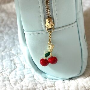 Stylish Marc Jacobs cosmetic bag. Features a mint green exterior with a cream panel and cute cherry zipper. Perfect for organizing essentials. Please note the small indent on the back.