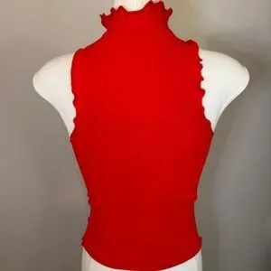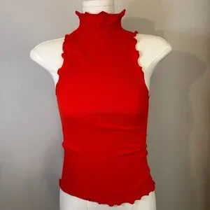 Stylish red sleeveless top. Features a mock neck and ruffled edges. Perfect for any occasion.