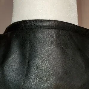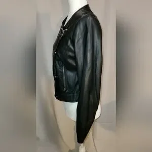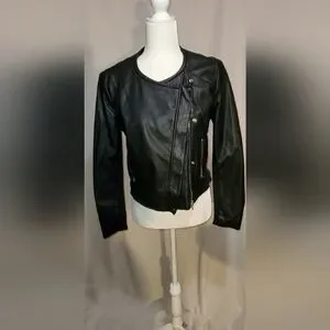 Zara vegan leather moto jacket with asymmetrical zipper and snap closure. Long sleeves with a stretchy, knit inlay along the inside sleeve--No rubbing or bunching of fabric! A great design element. Would look great with jeans or over a dress. Size Large. Light wear at back on neckline-and small blemish on front-you have to zoom to-see, barely visible-- see photos. She still looks great!