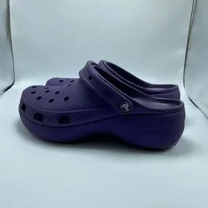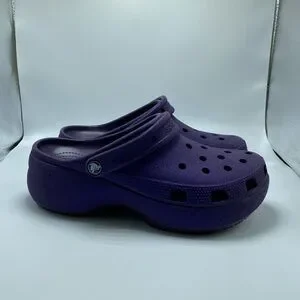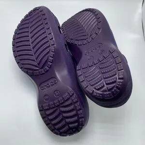 Stylish purple wedges by CROCS. Comfortable and durable design. Perfect for casual wear.sparkle glitter purple wedge heel 3 in.