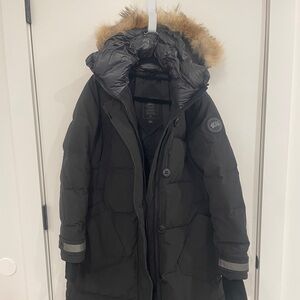 Excellent condition! I bought this coat at a sample sale in the summer and by the winter it didn’t fit. I wore it once during a crazy winter storm in KC and it was the warmest jacket I’ve ever worn. It was discounted at the sample sale because Canada Goose had to patch a tiny rip in the back. Hardly noticeable. Make an offer, she’s gotta go!