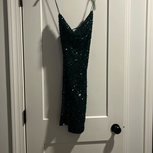 Homecoming dress, worn once, size large, emerald green with sequins, crossing straps on the back, missing a few sequins