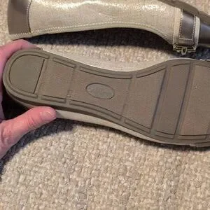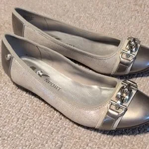 Stylish metallic flats with chain detail. Perfect for casual or dressy occasions. Never worn except to try on.