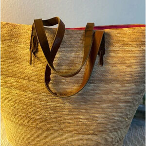 Mexico Givaway Straw Tote with pink interior lining. Tan and Pink.