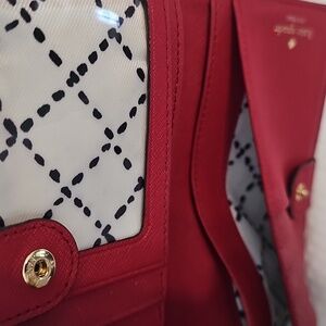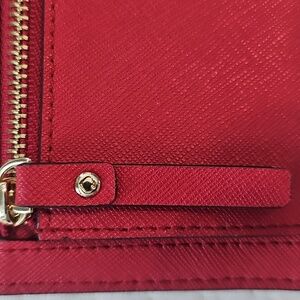 In great condition is this Red Kate Spade Wallet. It has room for 12 cards and a clear cover slot for an I.D. Includes a zipped pocket on the outside.