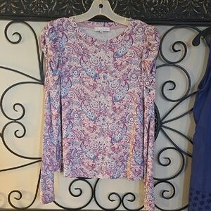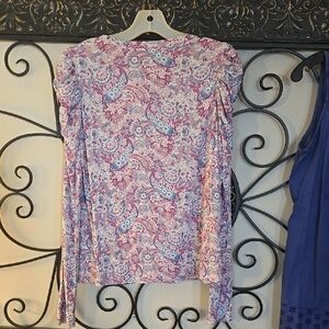 Elevate your wardrobe with this stylish retro paisley long sleeve top. Perfect for any occasion, this purple top adds a touch of elegance to your outfit.