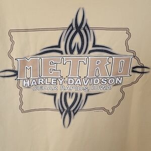 A pre-loved Mens Medium Light yellow/gold Harley-Davidson T-shirt from Metro Harley-Davidson in Cedar Rapids, Iowa. This is actually a vintage shirt as it was purchased in 2002, EUC, especially for its age. Please review the photos and measurements prior to purchasing.