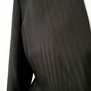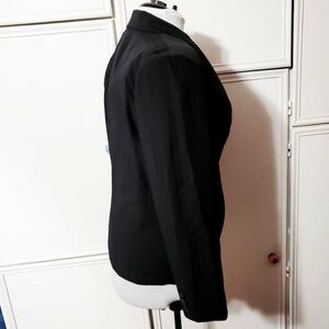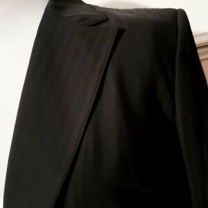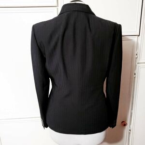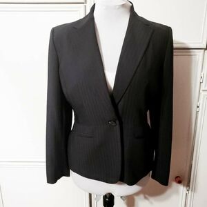 This high-quality tailored blazer has a blue and gold striped lining and a subtle striped exterior. A beautiful, professional blazer.